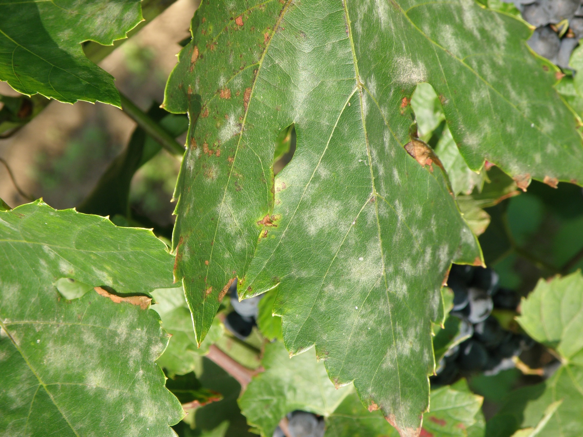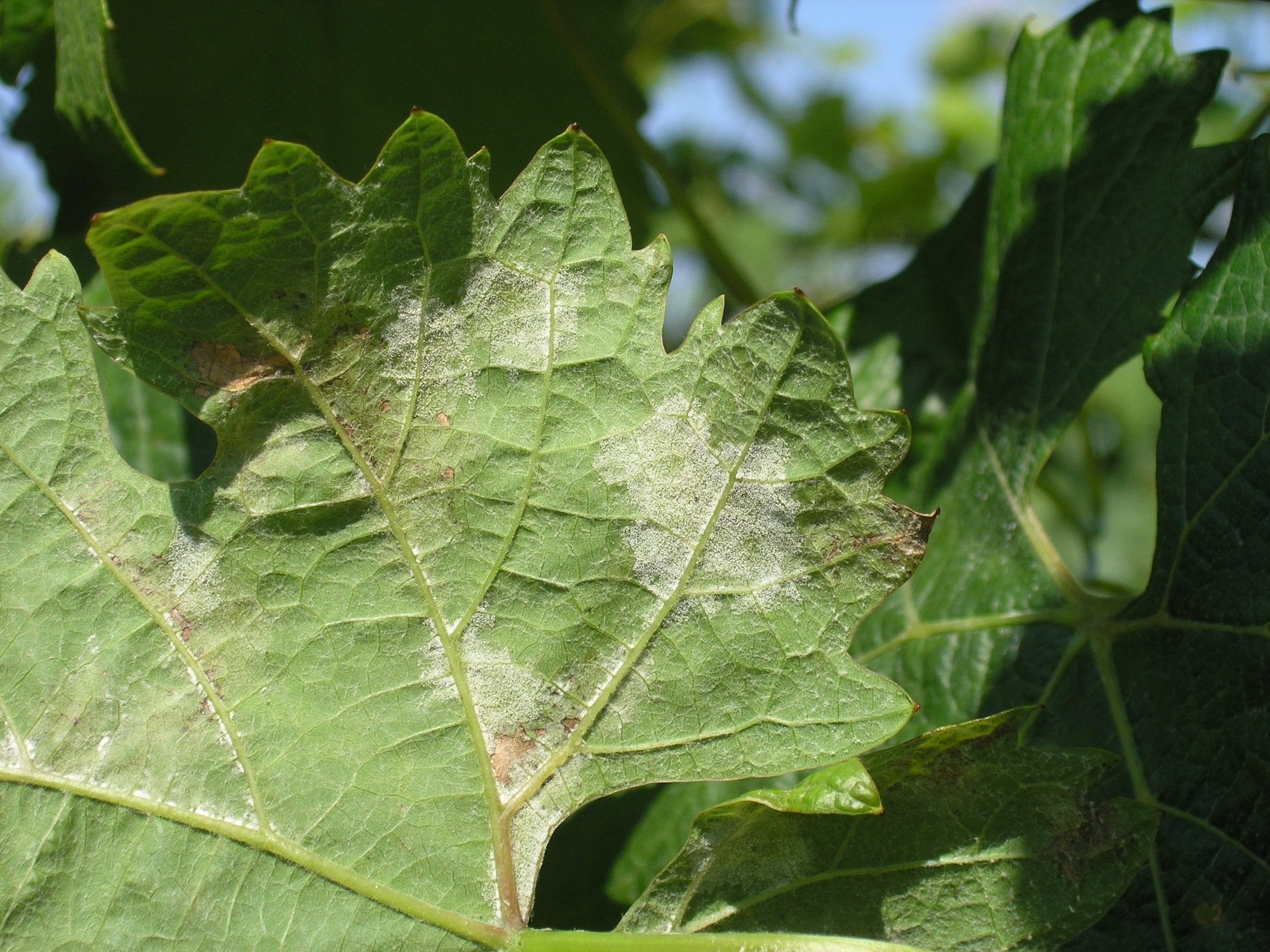 Obr. 2 Příznaky padlí révy na listech Obr. 3 Plíseň révy na spodní straně listu