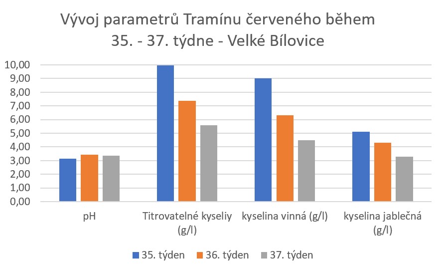 Pro ukázku vývoje kyselin jsme vybrali Tramín červený z trati Přední hora ve Velkých Bílovicích.