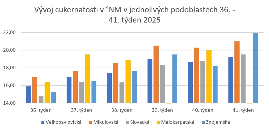 Průměrná hodnota cukernatosti u bílých odrůd je 20,9°NM a 20,1°NM u modrých odrůd. Hodnota pH zůstává pořád na průměrných na 3,1. Titrovatelné kyseliny se oproti minulému týdnu nepatrně snížily u bílých odrůd na průměrných 7,1 g/l. U modrých odrůd se téměř nezměnily a zůstávají kolem 8,0 g/l.