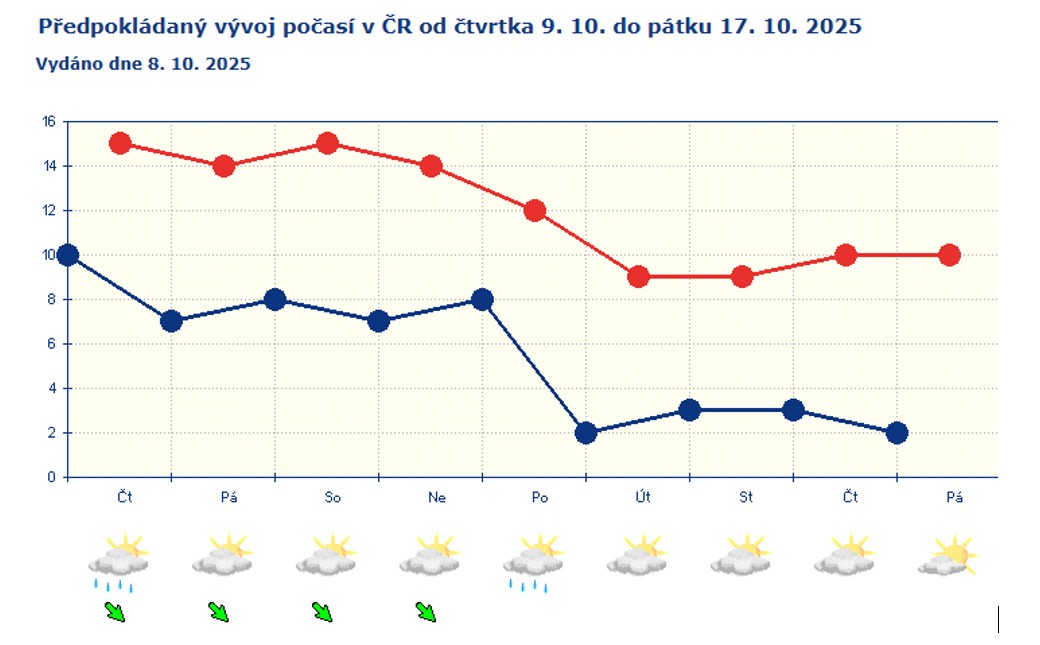 Předpokládaný vývoj počasí v následujících dnech je bez přeháněk s polojasnou až oblačnou oblohou. Už během pondělí dojde k dalšímu ochlazení, kdy denní teploty klesnou z 15 °C na 9 °C. I v noci budou postupně teploty klesat až ke 2 °C.Vinobraní se blíží ke konci. Přinášíme poslední letošní předsběrovou analýzu hroznů.