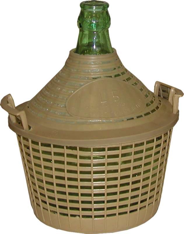 Výhody registraceSkleněný demižon v černém plastovém koši.