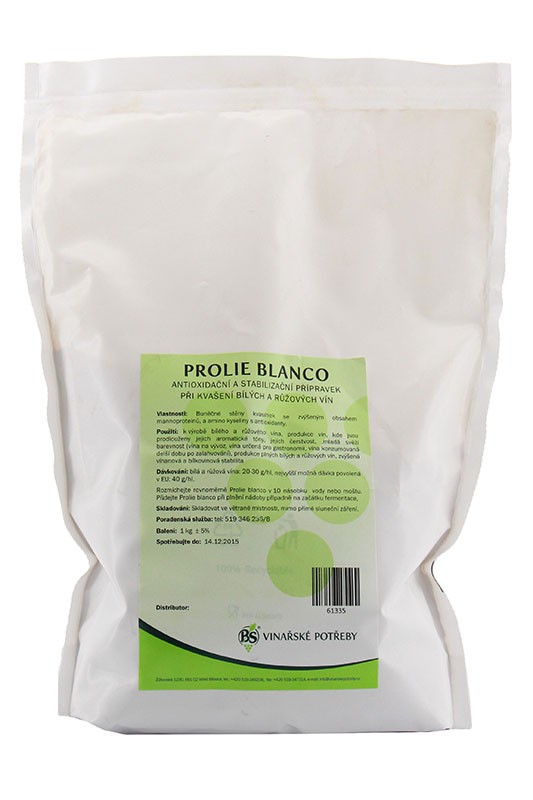 Výhody registraceProlie Blanco je fermentační přísada získaná tepelnou inaktivací kvasinek s vysokým obsahem aminokyselin se zvýšenými antioxidačními vlastnostmi. Metoda, ve které se provádí tepelná inactivace zvyšuje obsah volných mannoproteinů, které jsou ihned schopny využívat svoje stabilizační účinky v moštu. Výhody které jsou dosažitelné užíváním Prolie Blanco: Barva - chrání skvělou barevnost odstínů díky zvýšeným antioxidantům. Aroma - zvýšené aroma exotického ovoce, zvýšená perzistence čerstvého a ovocného aroma, díky reakcím mezi mannoproteiny a vonnými substancemi ve víně, zvýšená čistota aroma, neboť dochází k adsorpci pachů na buněčné stěny. Chuť - vnímání jemnosti a intenzity díky zvýšenému množství mannoproteinů a polysacharidů.Účinky - ochrana aromatických složek díky antioxidační činnosti síru obsahujících aminokyselin obsažených ve výrobku, zvýšená vínanová a proteinová stabilita díky brzkému přídavku mannoproteinů, řízená a dokončená fermentace díky proteinům, peptidům, vitamínům a růstovým faktorům dodaných kvasinkám.Užití:k výrobě bílého a růžového vína, produkce vín, kde jsou prodlouženy jejich aromatické tóny, jejich čerstvost, ,mladá svěží barevnost (vína na vývoz, vína určená pro gastronomii, vína konzumovaná delší dobu po zalahvování), produkce plných bílých a růžových vín, zvýšená vínanová a bílkovinová stabilita.
