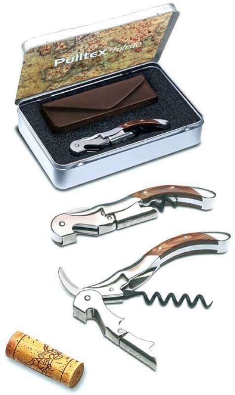 Set vývrtky Toledo a černého koženého pouzdra v kovové krabičce. Set obsahuje ergonomicky tvarovanou kapesní vývrtku v luxusnějším a masivnějším provedení, která výborně padne do ruky. Vývrtka má teflonovou spirálu a nožík pro ořez termokapsle. Pomocí této vývrtky a její dvoustupňové kloubové podpory velmi jednoduše a rychle vytáhnete jakýkoliv korek z láhve.