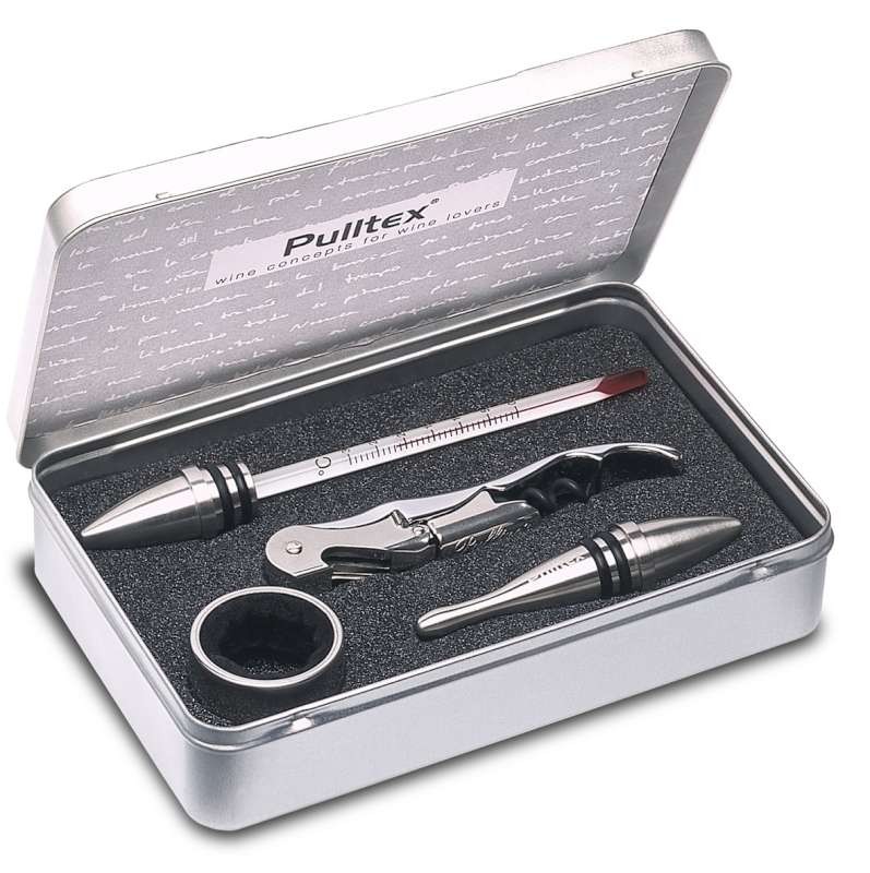 Set vývrtky Pulltap´s Classic, teploměru s uzávěrem, uzávěru na láhev a kapkového kroužku na hrdlo láhve. Set obsahuje ergonomicky tvarovanou kapesní vývrtku v luxusnějším a masivnějším provedení, která výborně padne do ruky. Vývrtka má teflonovou spirálu a nožík pro ořez termokapsle. Pomocí této vývrtky a její dvoustupňové kloubové podpory velmi jednoduše a rychle vytáhnete jakýkoliv korek z láhve.