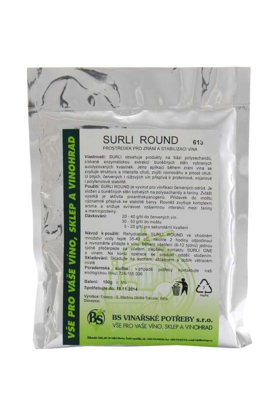 Výhody registraceProstředek pro zrání a stabilizaci vína. SURLI ROUND je vyvinut pro vinifikaci červených odrůd. Je složen z buněčných stěn bohatých na polysacharidy a taniny. Zvlášť vysoká je aktivita proanthokyanogenů. Přídavek do moštu významně přispívá ke stabilitě barvy. Rovněž zvyšuje komplexní aroma a snižuje svíravost vzájemnou interakcí mezi taniny a mannoproteiny. Dávkování: 20 - 40 g/hl do červených vín, 30 - 50 g/hl do moštu, 5 - 20 g/hl pro sekundární kvašení.