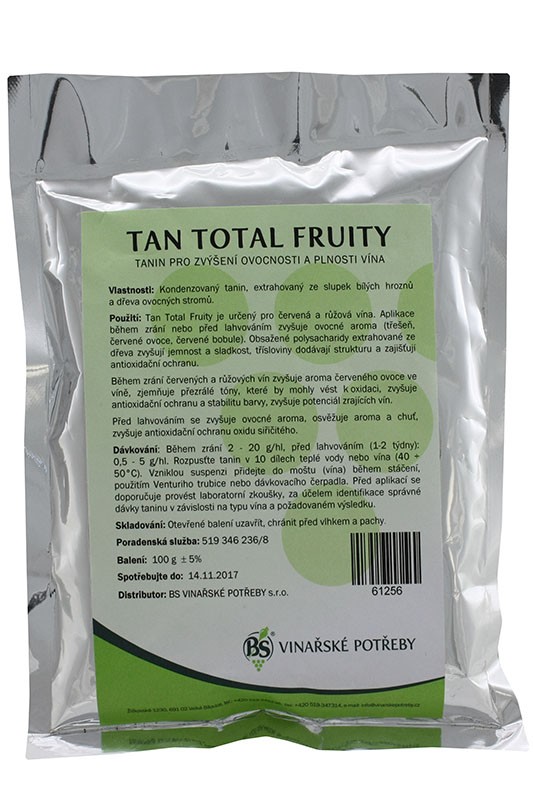 Výhody registraceTanin pro zvýšení ovocnosti a plnosti vína.Tan Total Fruity je určený pro červená a růžová vína. Aplikace během zrání nebo před lahvováním zvyšuje ovocné aroma (třešeň, červené ovoce, červené bobule). Obsažené polysacharidy extrahované ze dřeva zvyšují jemnost a sladkost, třísloviny dodávají strukturu a zajišťují antioxidační ochranu.Během zrání červených a růžových vín zvyšuje aroma červeného ovoce ve víně, zjemňuje přezrálé tóny, které by mohly vést k oxidaci, zvyšuje antioxidační ochranu a stabilitu barvy, zvyšuje potenciál zrajících vín.Před lahvováním se zvyšuje ovocné aroma, osvěžuje aroma a chuť, zvyšuje antioxidační ochranu oxidu siřičitého.