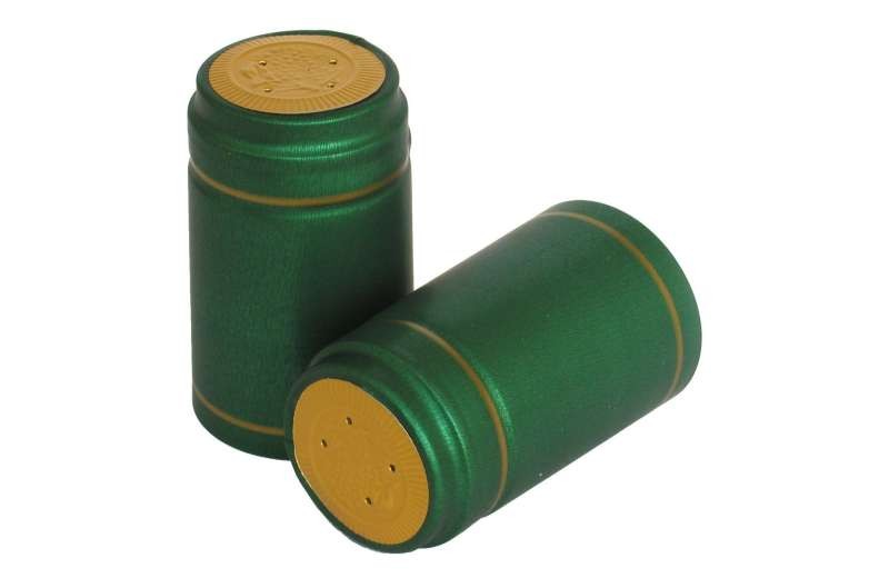 Teplem smrštitelný dekorativní uzávěr lahví v provedení PVC s horizontálním odtrhem, určeno pro láhve typu bordeaux a schlegel s páskovým ústím, průměr kapsle 25 - 30,3 mm, délka 55 mm, barva zelená metalíza mat, horní disk zlatá, spodní a horní zlatý pruh.